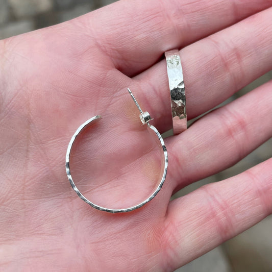 Small Sterling Silver Wide 3/4" Hammered Hoop Earrings