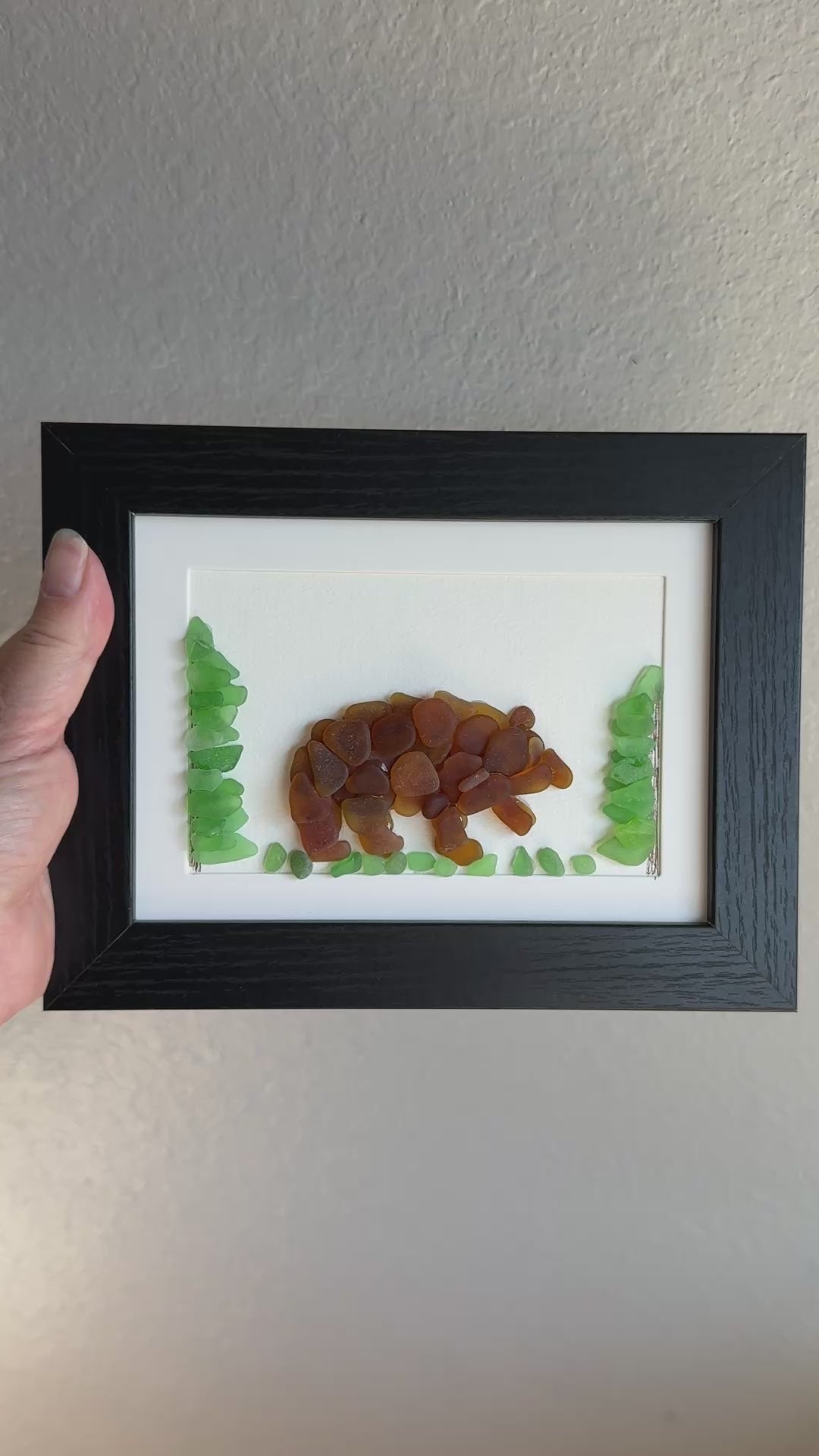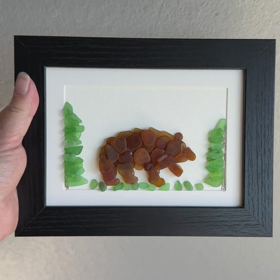 Bring the spirit of the wilderness into your home with this 5″×7″ framed sea glass brown bear and fir-tree artwork—handmade from genuine tide-worn sea glass.
