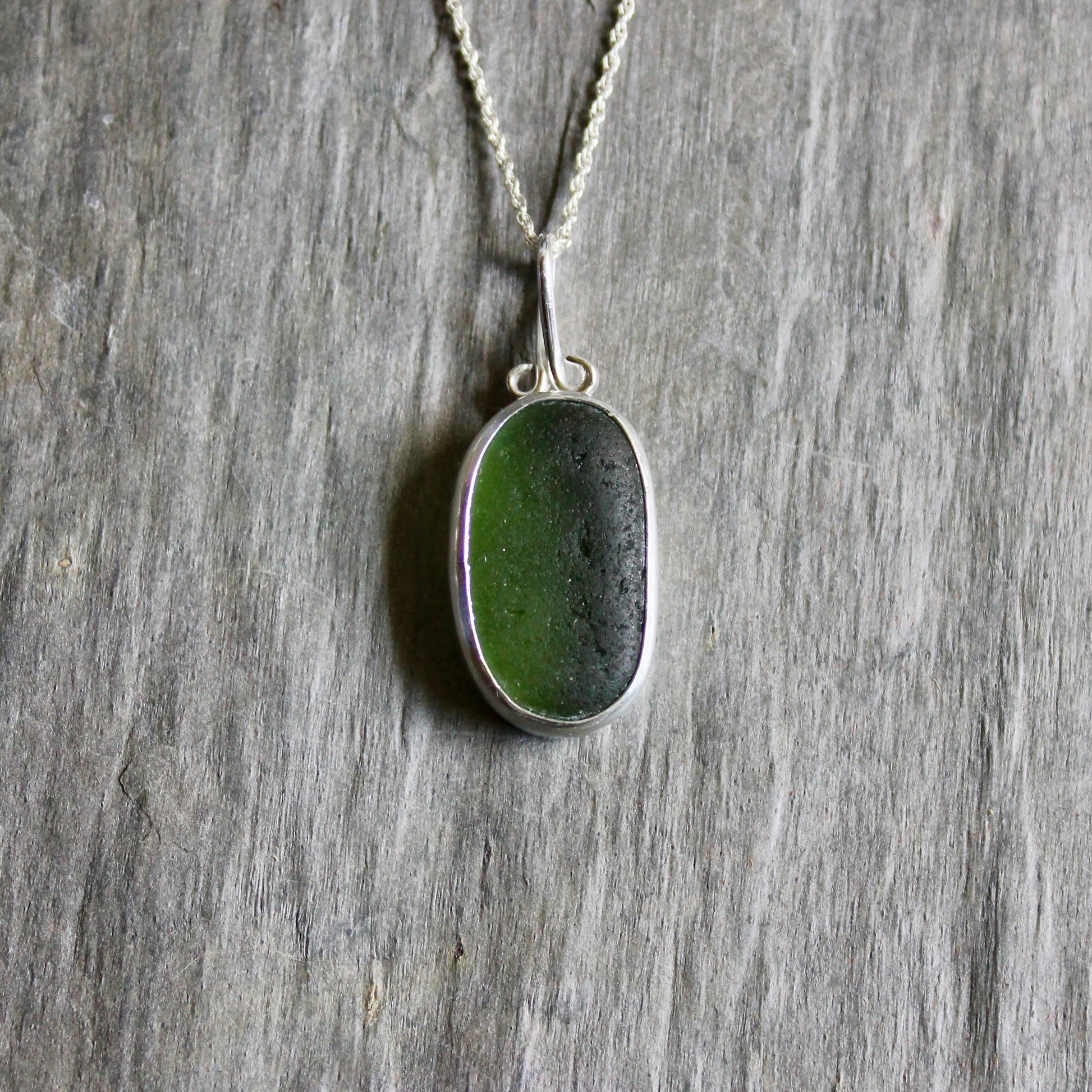 This necklace has a piece of dark forest green sea glass that is set in a fine & sterling silver bezel setting. It will arrive to you on a sterling silver chain that can be worn at 16, 18 or 20 inches. All of our sea glass is found and never altered in any way. Handmade by Barb Macy in Corvallis, OR.