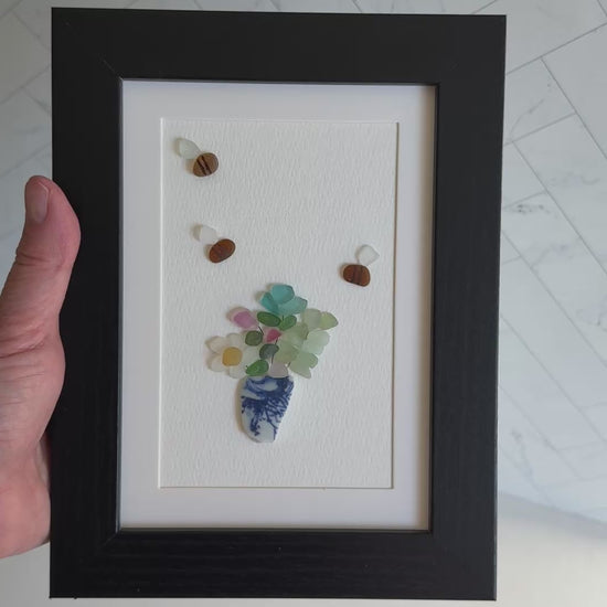 This artwork features a cheerful bouquet of sea glass flowers arranged in a vase silhouette made from genuine sea pottery, framed in a compact 5″×7″ wooden frame. The colored sea glass petals shimmer in soft natural light, framed by crisp white mat or background, and enclosed in a high-quality frame ready to hang or stand.
