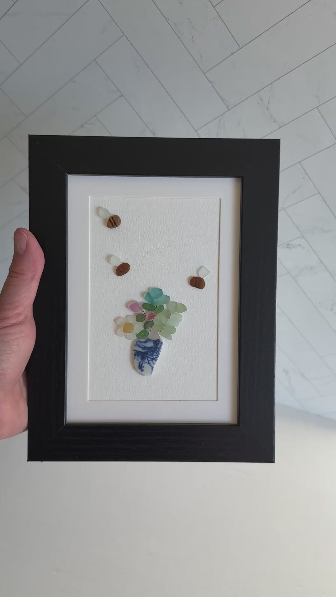 Bring vibrant coastal blooms into your home with this 5″×7″ framed sea-glass flower vase artwork—handmade from genuine beach-tumbled sea glass and ready to display.