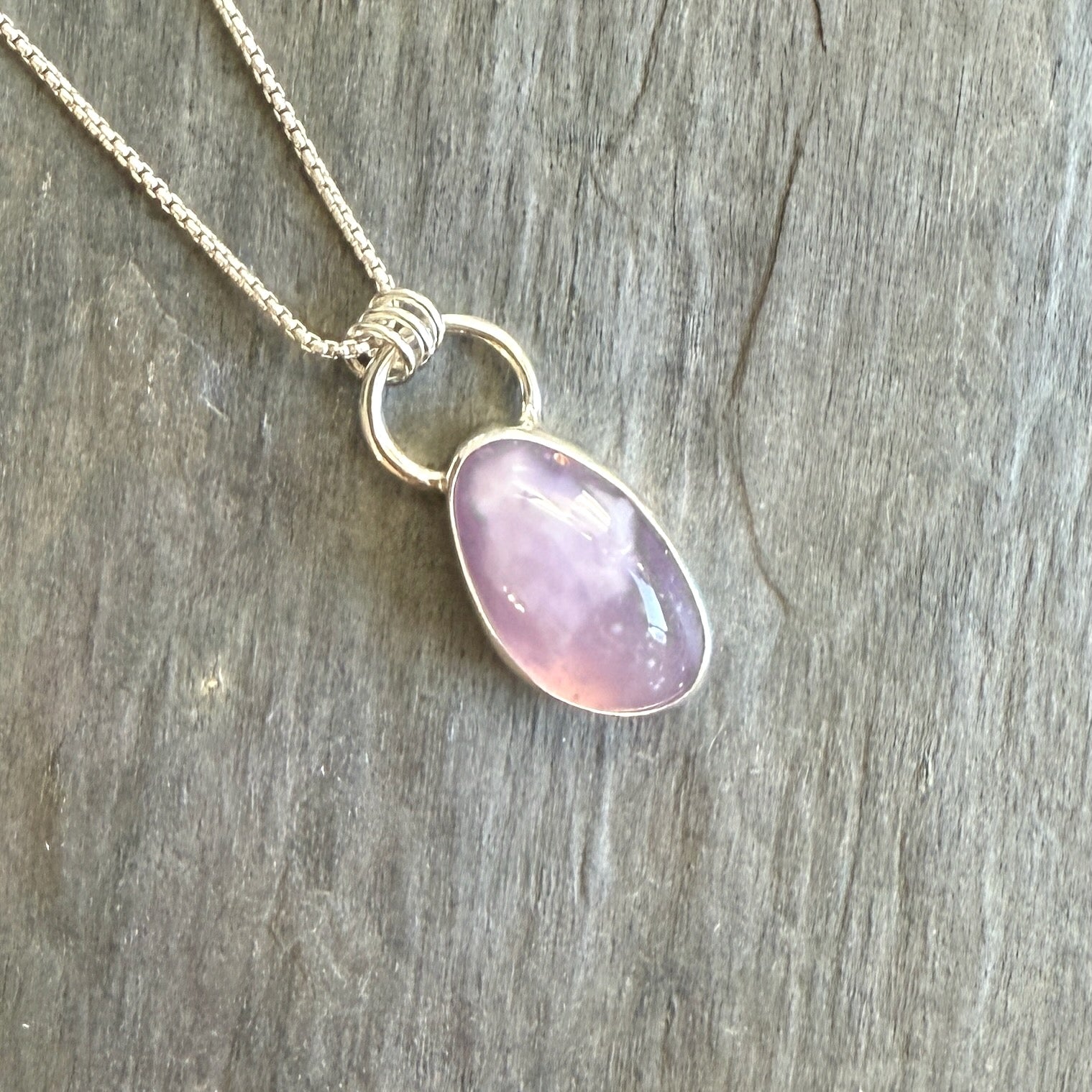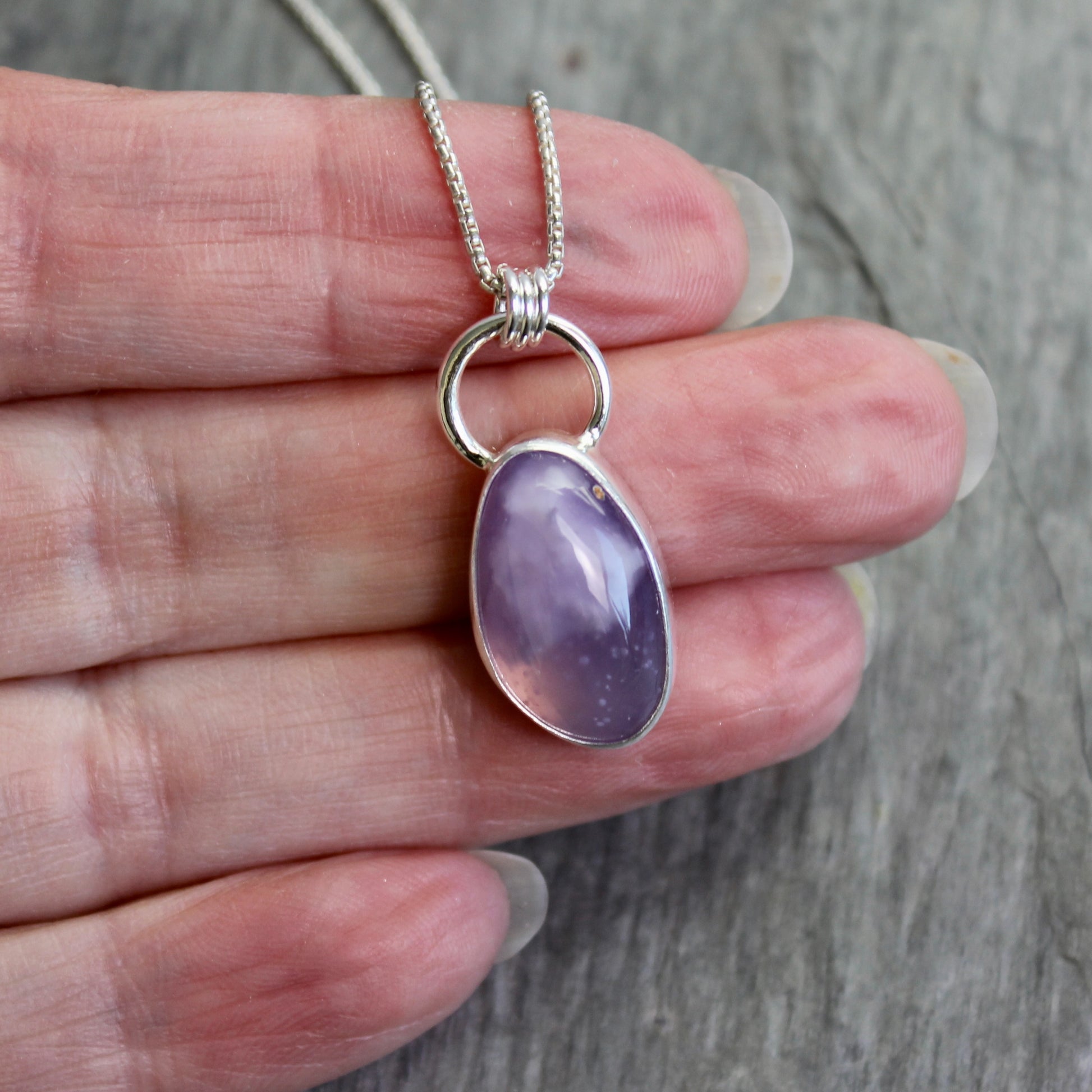 This necklace has a rare freeform pale Holley Blue plume agate cabochon that is set in fine and sterling silver . It comes with an adjustable sterling silver chain that can be worn at 16”, 18” or 20”. The stone was found and cut in Oregon and this piece of jewelry was handmade by Will Macy in Corvallis, OR.