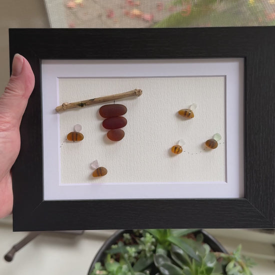 Warm amber sea glass forms each tiny bee, paired with frosted white wings that mimic their delicate flutter. A small piece of driftwood creates the perfect hive perch, adding earthy texture and a sense of movement to the scene. Every element is ocean-tumbled, sourced from collectors around the world, and arranged by hand on acid-free watercolor paper.