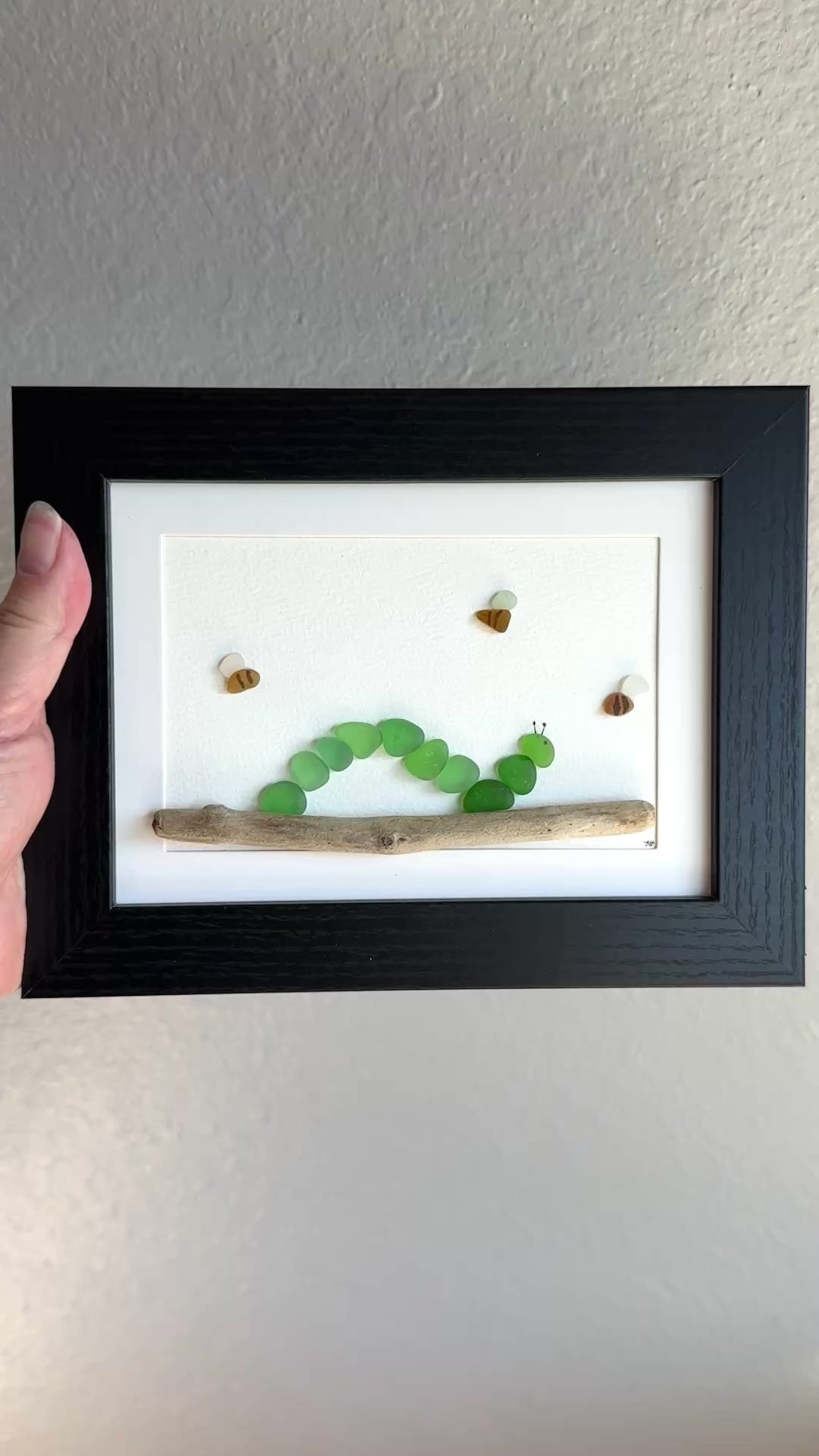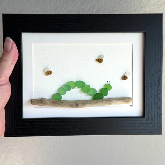 The artwork features a cheerful green sea glass caterpillar crawling on a driftwood branch, with two little sea-glass bees for added whimsy. It’s designed to fit easily into a child’s room, shelf or wall space and comes ready to hang or stand. Every piece of sea glass used is naturally tumbled by the sea and then artfully arranged and framed for lasting display.