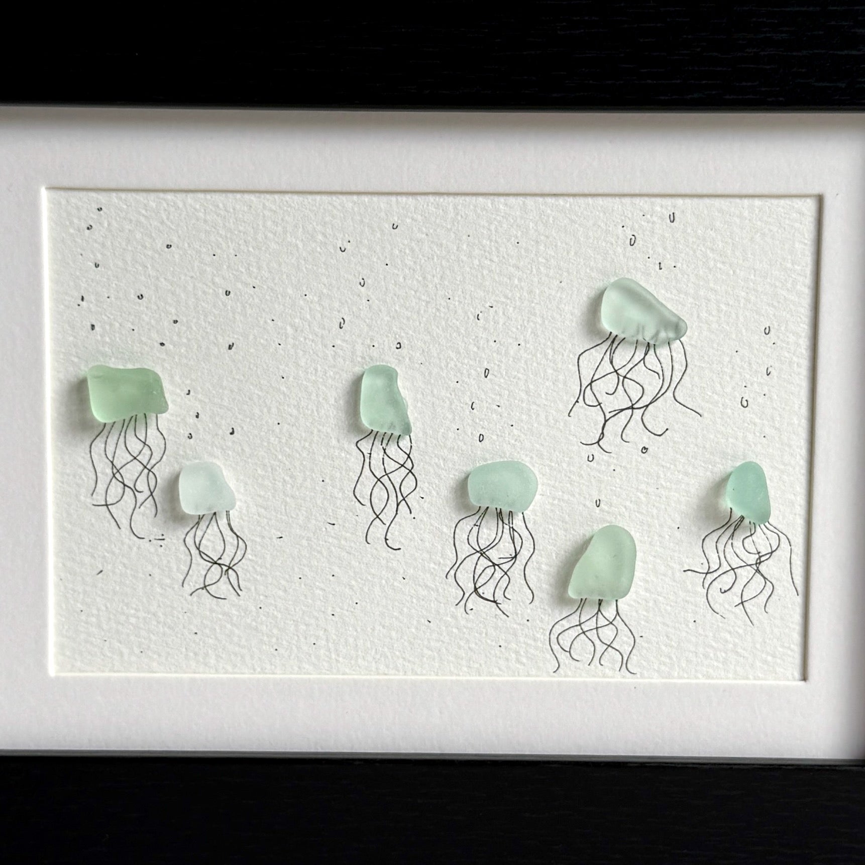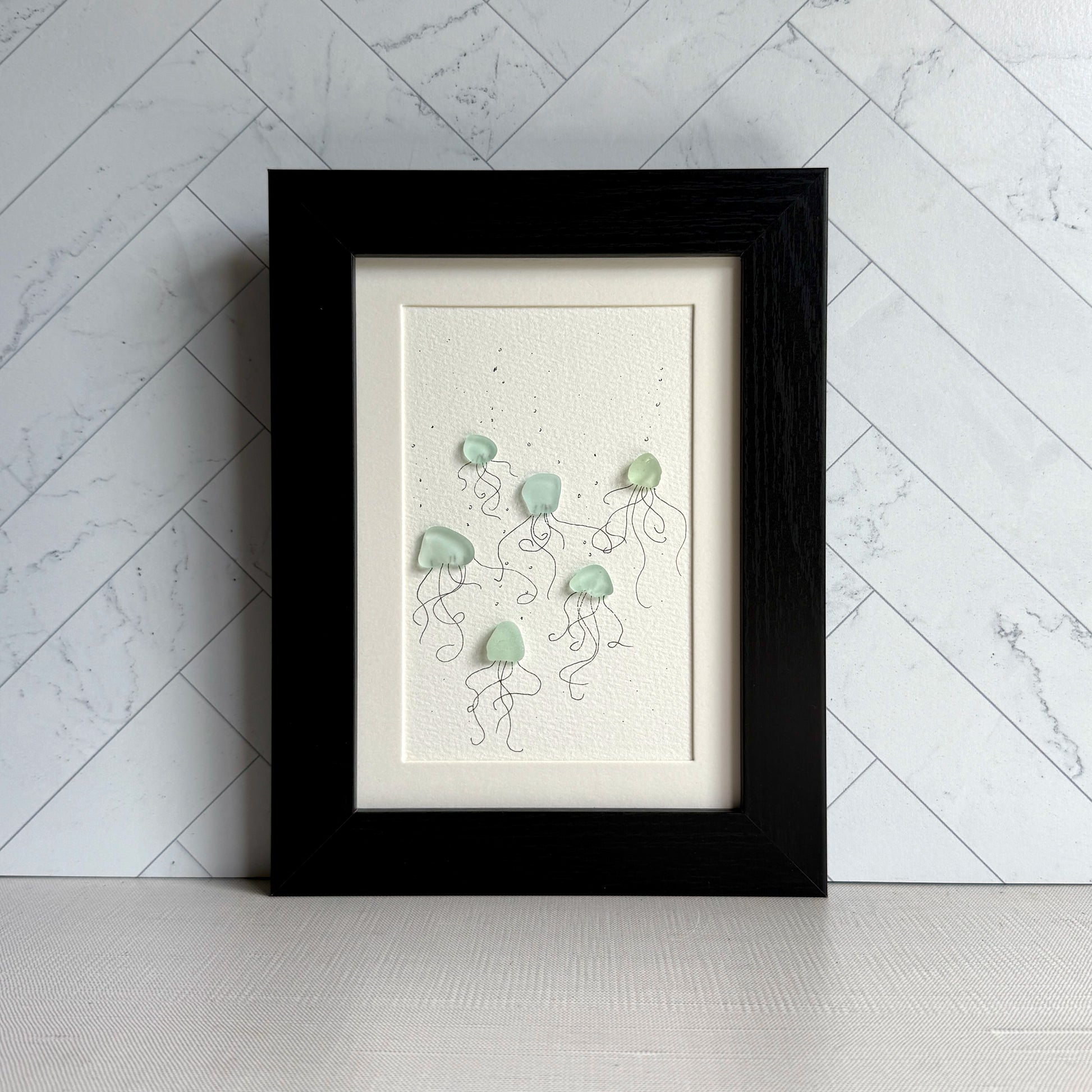 This is an adorable framed 5 x 7 inch sea glass art picture featuring jellyfish made from sea foam blue sea glass. This item is perfect for gift giving and is ready to hang or place on a shelf. Designs vary depending on what we have in stock. This photos show are examples of what you will receive.