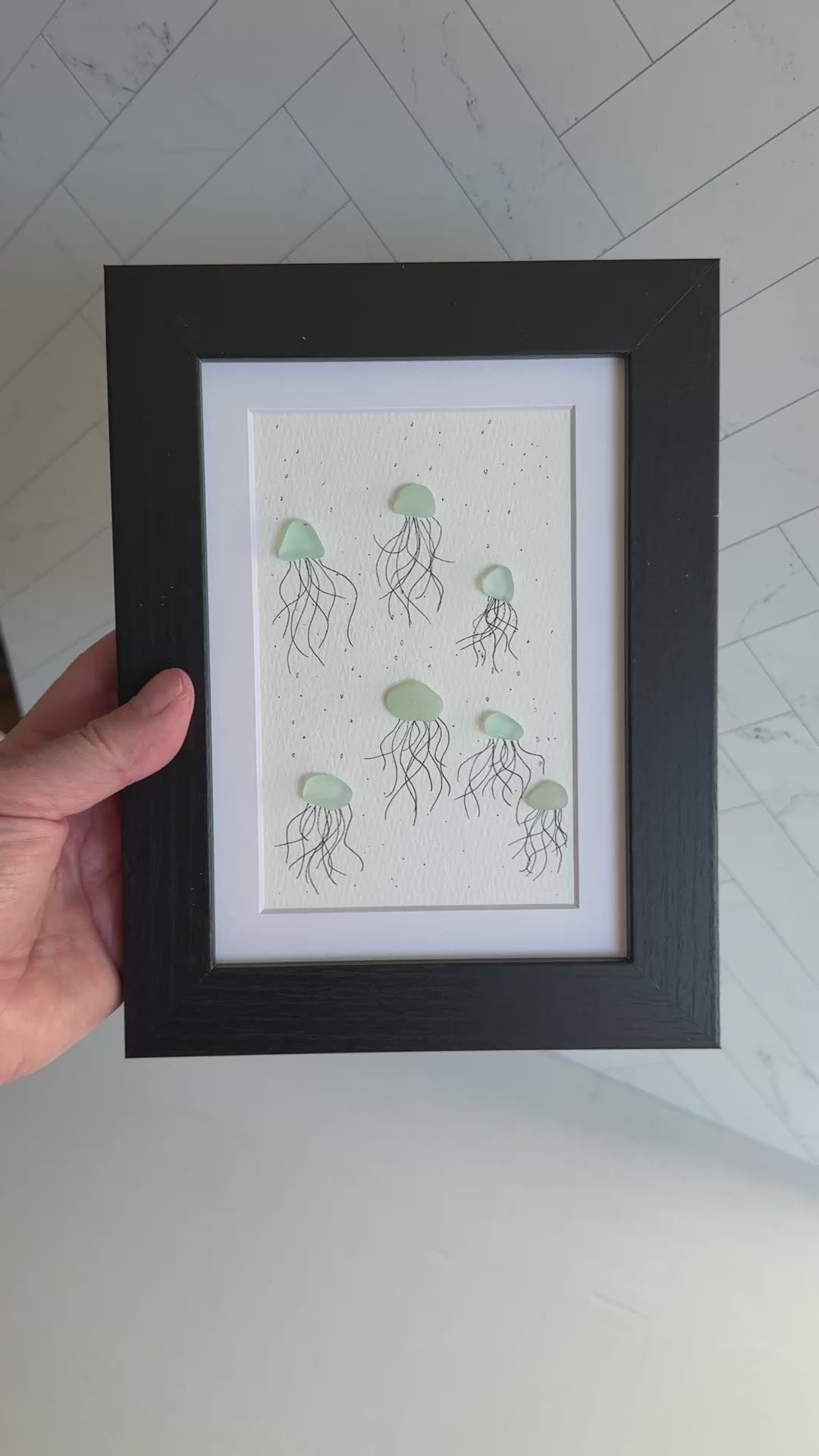 - Materials: Found sea glass (including aquamarine/sea-foam tones), acid-free watercolor paper, mat, wood frame (for framed variant)