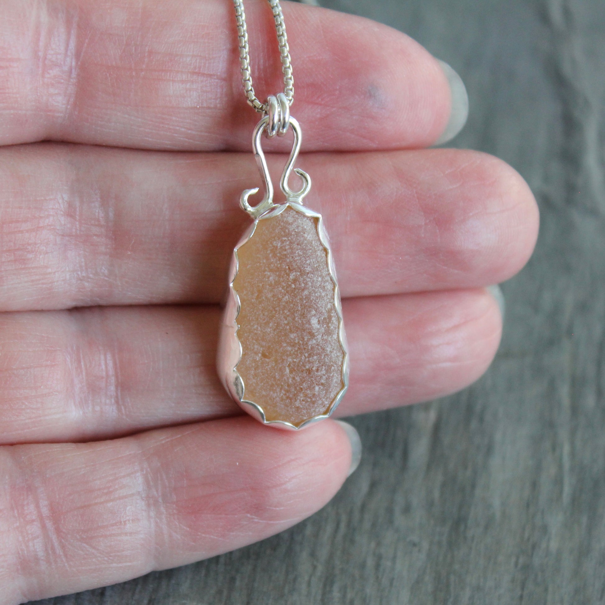 This necklace has a large piece of pale orange sea glass from the the Sea of Japan. It is set in a sterling & fine silver bezel with a swirly bail and the backplate cut out. And, it will arrive to you on an adjustable sterling silver chain that can be worn at 16, 18 or 20 inches. All of our sea glass is found and not altered in any way. This piece of jewelry is handmade by Barb Macy in Corvallis, OR.