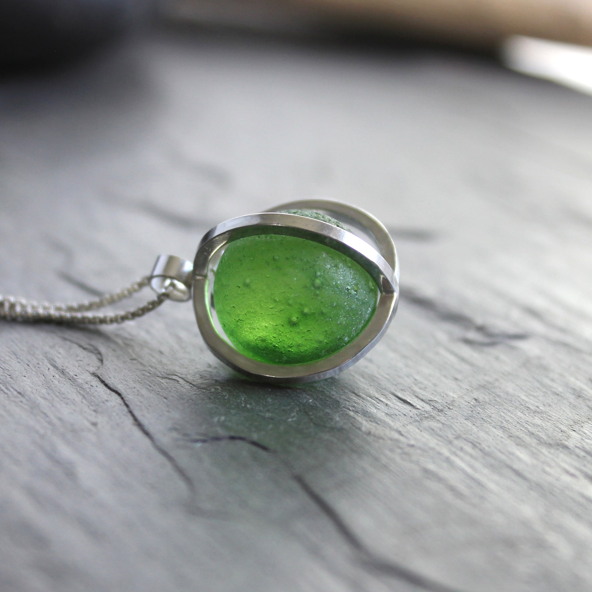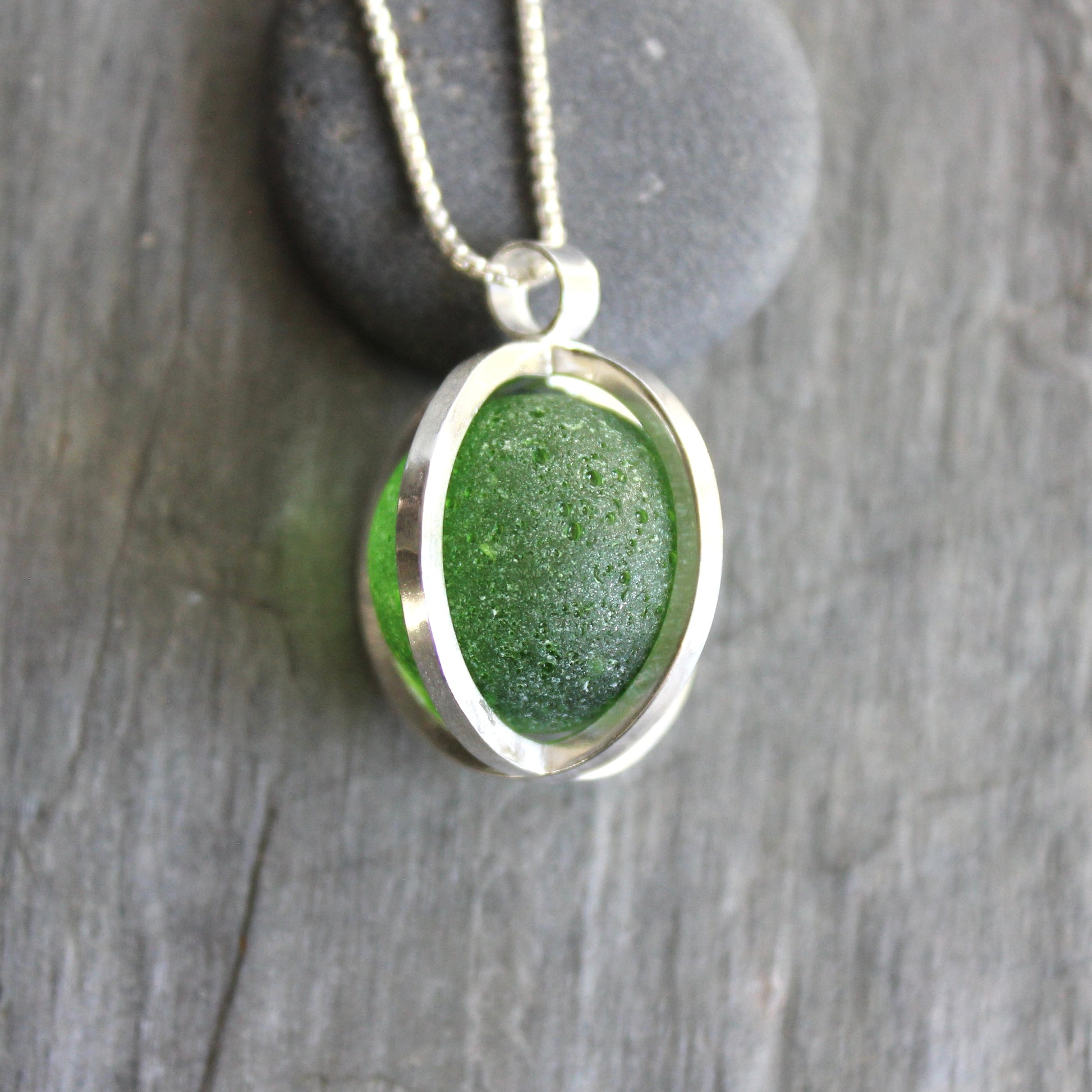 This pendant necklace has a rare green blue sea glass codd bottle marble from Japan! It is set in a sterling silver cage made from square wire. And, it will arrive to you on a sturdy sterling silver chain that can be worn at 16, 18 or 20 inches. The best thing about this necklace is that the marble moves and is meant to be fiddled with! All of our sea glass is always found and not altered in any way. Handmade by Barb Macy in Corvallis, Oregon.
