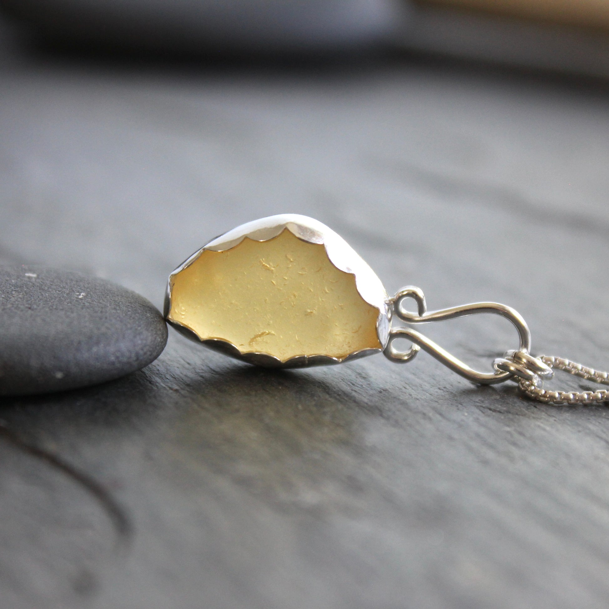 This necklace has a piece of rare yellow sea glass set in a scalloped bezel with a swirly bail. And, it will arrive to you on an adjustable sterling silver chain that can be worn at 16, 18 or 20 inches. All of our sea glass is found and not altered in any way and this piece of sea glass is from a beach in Japan. All of our sea glass jewelry was handmade by Barb Macy in Corvallis, OR.