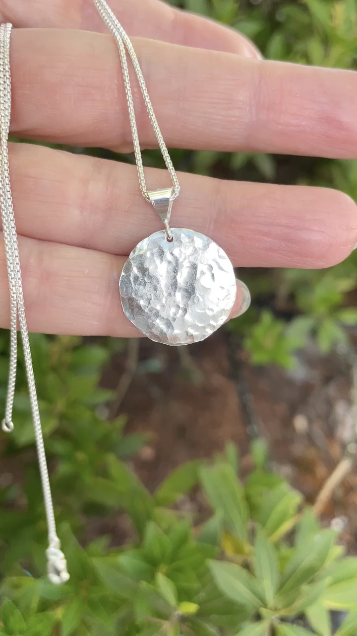 It's made with a substantial 1" sterling silver disc (about the size of a quarter) that I hammer for texture. The finished length is available in 16 or 18 inches. Chain style may vary, depending on what I have on hand...although it will always be sterling silver. If you need this longer than 16" or 18", please send me a message!