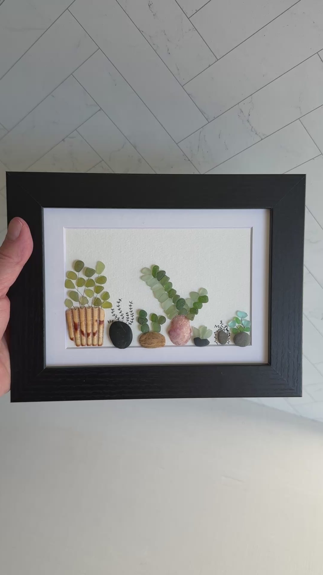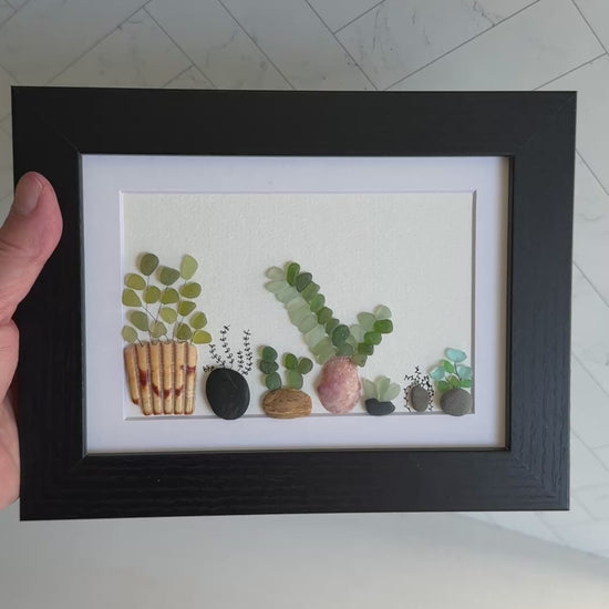 Bring a touch of seaside serenity and plant-lover charm to your home with this handmade framed sea glass succulent artwork.